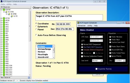 これまで、ACP Observatory controlでTAO Surveyの画像を撮るのは、複数のターゲットを、星座別等でまとめたplanファイルを作って、手動で撮っていました。 あるPlanでの撮影が終わったら、次のplanを手動で実行する手順でした。 天候や月の位置に合わせて臨…