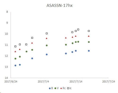 ASASSNが、たて座に見つけた新星です。 発見光度が暗めだったのですが、徐々に明るくなっています。 そろそろ、極大でしょうか?