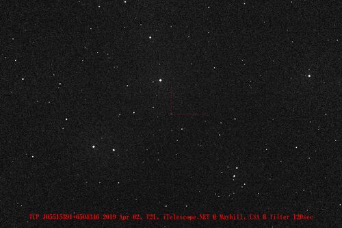TOCPに報告された西村さん発見の突発天体です。Schmeerさんによる増光前天体候補の同定結果ではわい新星の増光では無いかということです。 撮ってみました。天候が悪かったのと、予約が混んでいて、Bで1枚しか撮れませんでした。 西村さん、発見おめでとうご…