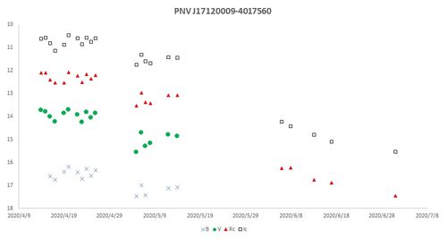 BraTSが4月に発見した突発天体ですが、Kawashさんらの分光観測で新星と確認されたそうです(ATel #14118)。 確認が遅れた理由について、Kawashさんらは、(コロナで)天文台封鎖が行われた時期経っだからではないかと推定されています。 光度曲線です。