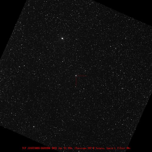 上田さんがTOCPに報告された新星候補です。 分光確認はまだですが、明るさからして新星に間違い無いでしょう? 上田さん、発見、おめでとうございます。 梅雨時なのが、恨めしいです。 (追記) Munariさんらによって、新星と分光確認されました。(ATel #14704)
